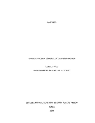 Este documento proporciona información sobre las wikis, incluyendo su definición, historia, características, ejemplos de sitios wiki gratuitos y una exploración de Wikispaces. Las wikis son sitios web colaborativos que permiten a los usuarios crear y editar contenido de forma fácil y rápida. Se originaron en la década de 1990 y Wikipedia es el wiki más grande. Algunas características clave de las wikis son que permiten editar páginas fácilmente y recuperar versiones anteriores. Existen
