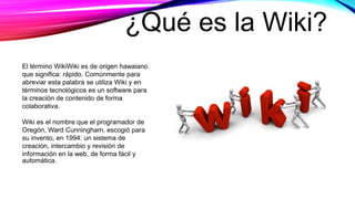 El documento explica que un wiki es un software para crear contenido de forma colaborativa. Los wikis permiten que múltiples usuarios creen y editen páginas web de forma sencilla para compartir conocimiento sobre un tema. El propósito de un wiki es permitir que una comunidad de usuarios trabajen juntos en construir contenido completo sobre un tema.
