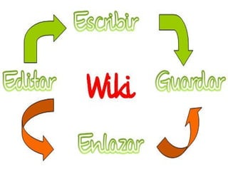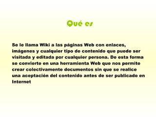 Este documento define una wiki como una página web colaborativa que permite que cualquier persona visite y edite su contenido, incluyendo texto, imágenes y enlaces. Explica que el término "wiki" proviene del hawaiano y significa "rápido". Además, describe cómo una wiki permite a los usuarios crear páginas web de forma sencilla para compartir conocimiento sobre un tema común, citando a Wikipedia como un ejemplo prominente.