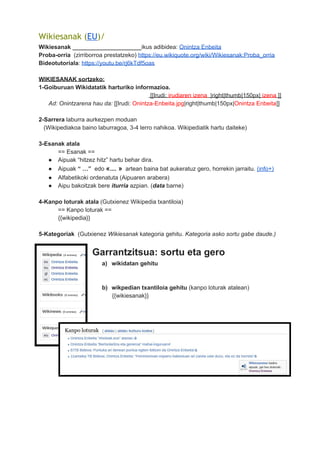 El documento proporciona instrucciones sobre cómo crear entradas en Wikiquotes y Wikiesanak, describiendo los elementos necesarios como la ficha de autor, citas, y enlaces externos. También establece normas para organizar las citas y la importancia de vincular los artículos con Wikidata y Wikipedia. Se enfatiza la necesidad de seguir un formato determinado y mantener consistencia en la presentación.