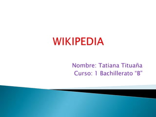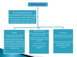 Este documento proporciona información sobre Wikipedia. Se describe a Wikipedia como una enciclopedia libre creada por Wiki media que permite a los usuarios editar libremente las páginas de texto. Se menciona que Wikipedia tiene más de 20 millones de usuarios y 282 idiomas, y se ha convertido en una gran fuente de búsqueda a nivel mundial.