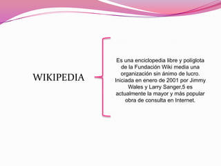 El documento presenta un resumen de Wikipedia, la enciclopedia libre en línea, indicando que fue iniciada en 2001 por Jimmy Wales y Larry Sanger como un proyecto sin fines de lucro de la Fundación Wikimedia. Explica que Wikipedia permite a los usuarios crear, modificar o eliminar de manera colaborativa los textos o "páginas wiki", los cuales tienen títulos únicos, y describe los pasos básicos para editar un artículo.
