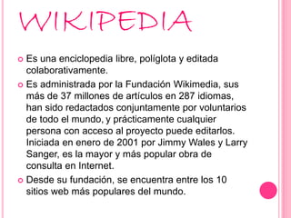 Wikipedia es una enciclopedia libre, multilingüe y editada colaborativamente por voluntarios de todo el mundo, que contiene más de 37 millones de artículos en 287 idiomas. Fue iniciada en 2001 por Jimmy Wales y Larry Sanger y actualmente es administrada por la Fundación Wikimedia, siendo la mayor obra de consulta en Internet y uno de los 10 sitios web más populares a nivel mundial.