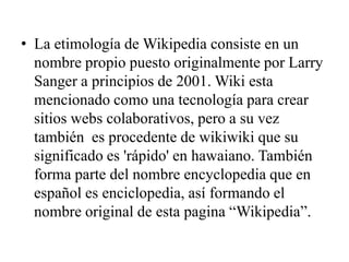 Wikipedia es una enciclopedia libre en línea creada originalmente por Larry Sanger en 2001. El nombre "Wikipedia" proviene de la combinación de "wiki", que significa rápido en hawaiano, y "encyclopedia". Wikipedia permite que cualquier persona edite sus artículos, excepto algunas excepciones, y tiene como objetivo proveer acceso gratuito al conocimiento humano.