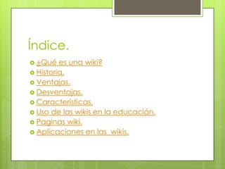 Wikis are websites that allow multiple users to easily edit and modify pages through a web browser. They originated in the 1990s as collaborative websites and have since been used for applications like Wikipedia. Wikis have advantages like easy collaboration and dynamic updating but also disadvantages like potential inaccuracies if not properly monitored.