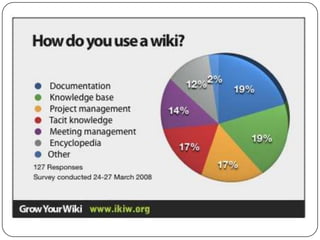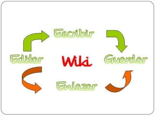 Este documento describe qué es un wiki. Un wiki es un sitio web cuyas páginas pueden ser editadas por múltiples voluntarios a través de un navegador web. Los wikis permiten la creación colaborativa de contenido de forma fácil y rápida, incluso para usuarios sin experiencia técnica. El término "wiki" proviene de la palabra hawaiana para "rápido" y fue acuñado por el programador Ward Cunningham en 1994 para su sistema de creación y edición de información en la web.