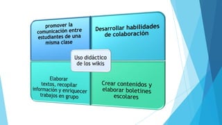 Las wikis son sitios web cuyas páginas pueden ser editadas fácilmente por múltiples usuarios para construir contenido colaborativo sobre temas específicos. Son una de las herramientas más útiles para conectar grupos de estudiantes en diferentes lugares y realizar proyectos colaborativos. Tanto docentes como estudiantes pueden crear y publicar contenido educativo en una wiki sin necesidad de instalar software o tener conocimientos de programación.