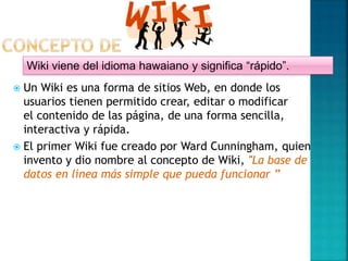 Un wiki es un sitio web que permite a los usuarios crear y editar fácilmente el contenido de manera colaborativa. El primer wiki fue creado por Ward Cunningham y permite la edición colectiva de documentos a través de un navegador web. El wiki más famoso es Wikipedia, la enciclopedia en línea editada por la comunidad.