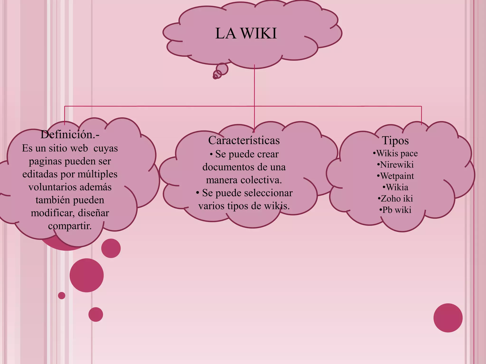 Un wiki es un sitio web colaborativo donde múltiples usuarios pueden editar, modificar y compartir páginas de manera colectiva. Existen diferentes tipos de wikis como Wikispace, Nirewiki y Wetpaint que permiten crear documentos de forma cooperativa.