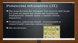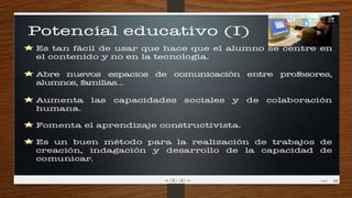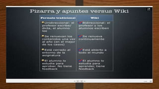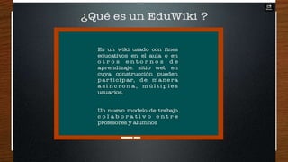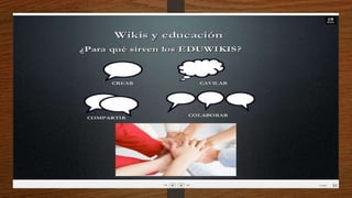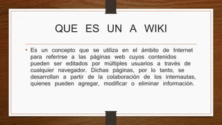 Este documento describe qué es una wiki, para qué sirve y sus ventajas y desventajas. Una wiki es una página web cuyos contenidos pueden ser editados por múltiples usuarios a través de cualquier navegador. Sirve para crear páginas web de forma rápida y permite a los usuarios agregar información de manera flexible. Sus ventajas incluyen la facilidad para crear páginas de forma instantánea y colaborativa, pero una desventaja es que la veracidad de la información puede verse afectada dado que cual