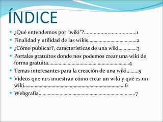 Este documento resume qué es una wiki. Explica que una wiki es un software para crear contenido de forma colaborativa. Detalla algunas definiciones de wiki y ejemplos como Wikipedia. También describe la finalidad y características de las wikis, como permitir que varios usuarios creen páginas web sobre un tema de forma sencilla. Incluye portales para crear wikis gratis y temas interesantes para wikis junto con enlaces a videos sobre cómo crear una.