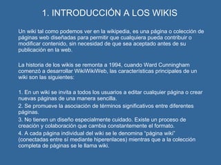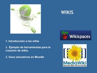 Este documento describe los wikis y sus usos educativos. Explica que un wiki permite que los usuarios editen y modifiquen contenido de forma colaborativa. Luego describe dos herramientas wiki populares: Wikispaces y MediaWiki. Wikispaces es una plataforma en línea fácil de usar, mientras que MediaWiki requiere instalación en un servidor. El documento también explica cómo los wikis pueden integrarse en Moodle para apoyar el aprendizaje.