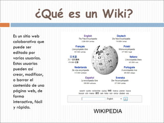 El documento describe el uso de wikis como recursos educativos, explicando su definición, ventajas y diferencias con los blogs. Se presentan pasos detallados para crear y personalizar un wiki, así como para añadir contenido como textos, imágenes y videos. Además, se mencionan ejemplos y recursos útiles para la creación de wikis en el contexto académico.