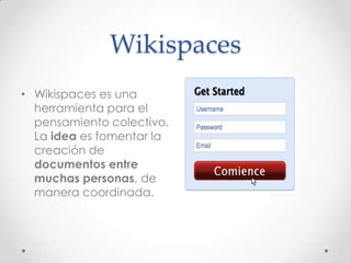 Wikispaces es una herramienta en línea que permite a múltiples personas editar documentos de forma coordinada. Las páginas de Wikispaces son editables por cualquier persona con acceso a Internet y cuentan con una sección de discusión para que los miembros puedan coordinarse. Wikispaces es útil para documentos que requieran el punto de vista de varias personas, para coordinar proyectos entre equipos o para compartir información de manera ordenada y accesible a todos.