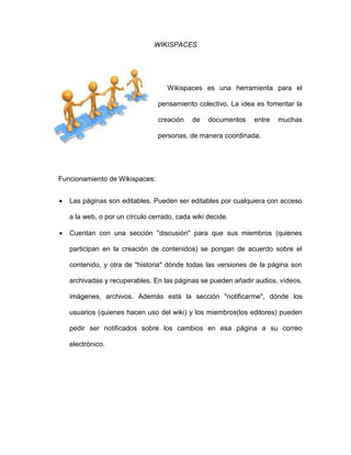 Wikispaces es una herramienta en línea que permite a múltiples usuarios editar documentos de forma colaborativa. Los usuarios pueden editar páginas, discutir cambios, y ver un historial de versiones. Wikispaces se puede usar para documentar puntos de vista de grupo, coordinar organizaciones, e intercambiar información. Ofrece cuentas gratuitas y de pago para uso individual, educativo y corporativo.