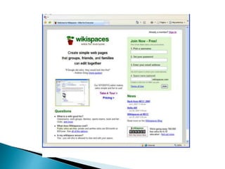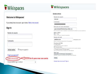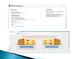 El documento proporciona instrucciones para crear una wiki en la plataforma Wikispaces. Indica que los usuarios deben registrarse en el sitio web con su nombre, correo electrónico y contraseña, darle un nombre a su wiki, y luego pueden personalizarla agregando una foto de perfil y configurando opciones en la sección de ajustes. Una vez creada, los usuarios pueden administrar y editar su wiki agregando páginas, imágenes, y videos.