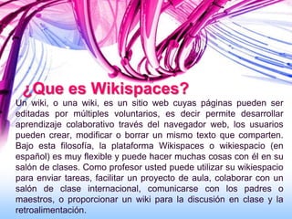 Wikispaces es un sitio web que permite a múltiples usuarios crear y editar colaborativamente páginas web a través de un navegador. Los profesores pueden usar Wikispaces para enviar tareas, facilitar proyectos de aula, comunicarse con padres y estudiantes, y proporcionar wikis para discusiones en clase. Para crear un Wikiespace, los usuarios deben registrarse en wikispaces.com e ingresar información personal para configurar su cuenta.
