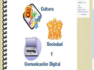 El documento describe las características de un wiki creado para discutir temas relacionados con la cultura, sociedad y comunicación digital. Explica que la cultura digital se ha integrado a la sociedad debido al desarrollo de las tecnologías de comunicación y que éstas han adquirido un papel fundamental. El wiki permite a los miembros publicar contenido, imágenes y enlaces relacionados con estos temas.