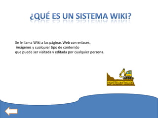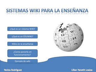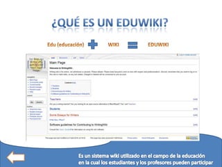 Un sistema wiki permite a los usuarios crear y editar contenido de forma colaborativa en páginas web. Un eduwiki es un wiki utilizado para la enseñanza, donde los estudiantes pueden trabajar juntos en proyectos y compartir información de forma flexible. Aunque los estudiantes a veces se sienten incómodos publicando sus ideas o que otras personas las editen, los wikis pueden ser una herramienta útil en el aula si el profesor guía a los estudiantes en su uso y propósito.
