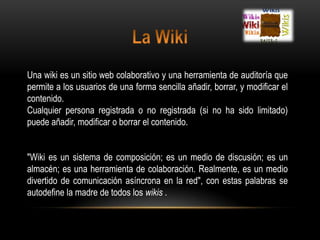Un wiki es un sitio web colaborativo donde los usuarios pueden agregar, editar o eliminar contenido fácilmente. Los wikis permiten la creación colectiva de conocimiento a través de la discusión y edición abierta. Se originaron como herramientas para compartir patrones de diseño de software y fueron popularizados por Wikipedia. Los wikis son útiles para la comunicación en equipos, proyectos colaborativos y la educación al fomentar la participación y el aprendizaje entre pares.