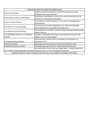 Este documento proporciona 10 consejos para mantener un ordenador en buen estado, incluyendo descargar los últimos controladores, usar un buen antivirus, ser cuidadoso con los archivos descargados, usar un firewall, mantener el ordenador limpio desinstalando programas no utilizados, y leer los manuales de instalación cuidadosamente.
