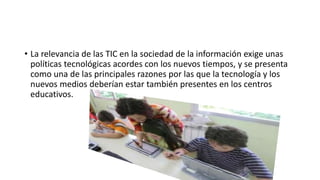 El documento argumenta que la revolución educativa no es posible sin la integración de herramientas tecnológicas en el aula. La integración de las TIC en el currículo escolar es un proceso gradual que depende de factores como los recursos tecnológicos disponibles, la competencia digital de los profesores, los contenidos digitales apropiados, y el apoyo administrativo. Hay tres razones principales para usar la tecnología en la educación: la alfabetización digital de los estudiantes, aumentar la productividad, e inno