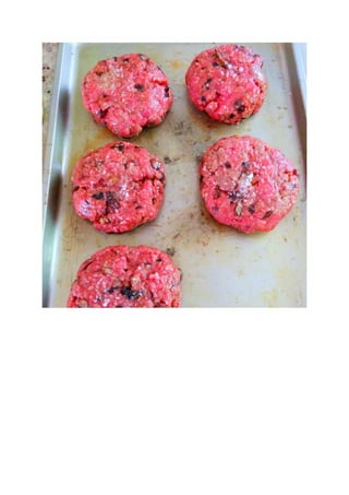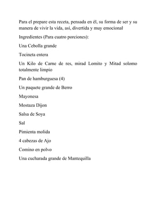Este documento presenta la receta de "Willi The Pilli Burguer", una hamburguesa creada para el hijo menor del autor llamado Guillo. La receta incluye carne molida de res mezclada con tocino, cebolla y ajo sofritos, y forma hamburguesas que se cocinan a la parrilla. La hamburguesa se sirve en un pan tostado, acompañada de una salsa verde hecha con berro, mostaza, mayonesa y salsa de soya.