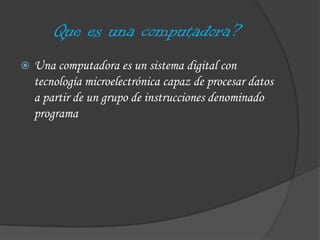 Este documento describe la evolución de las computadoras a través de las diferentes generaciones, desde los primeros dispositivos de contabilidad como el ábaco hasta las computadoras modernas de la sexta generación. Explica que las primeras generaciones utilizaban válvulas y tarjetas perforadas, mientras que generaciones posteriores introdujeron transistores, circuitos integrados y microprocesadores, llevando al desarrollo de las primeras computadoras personales en la quinta generación.