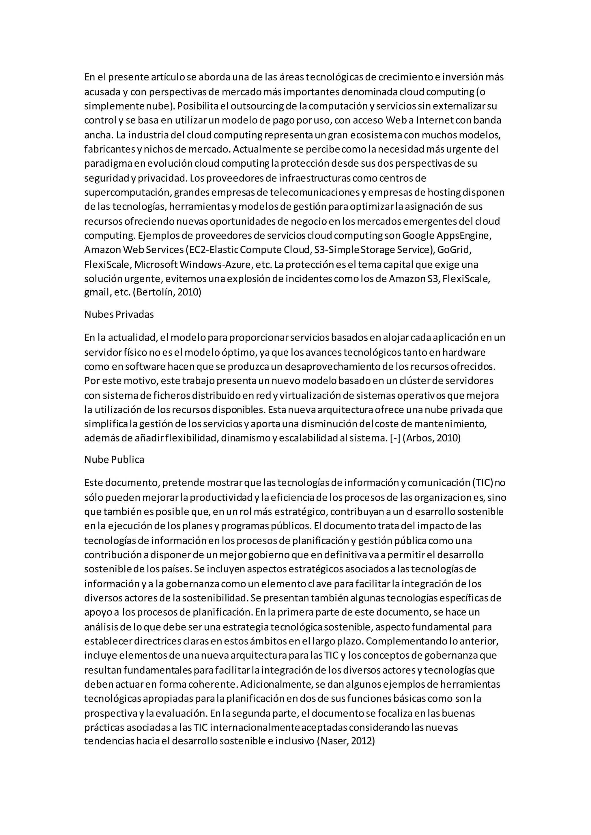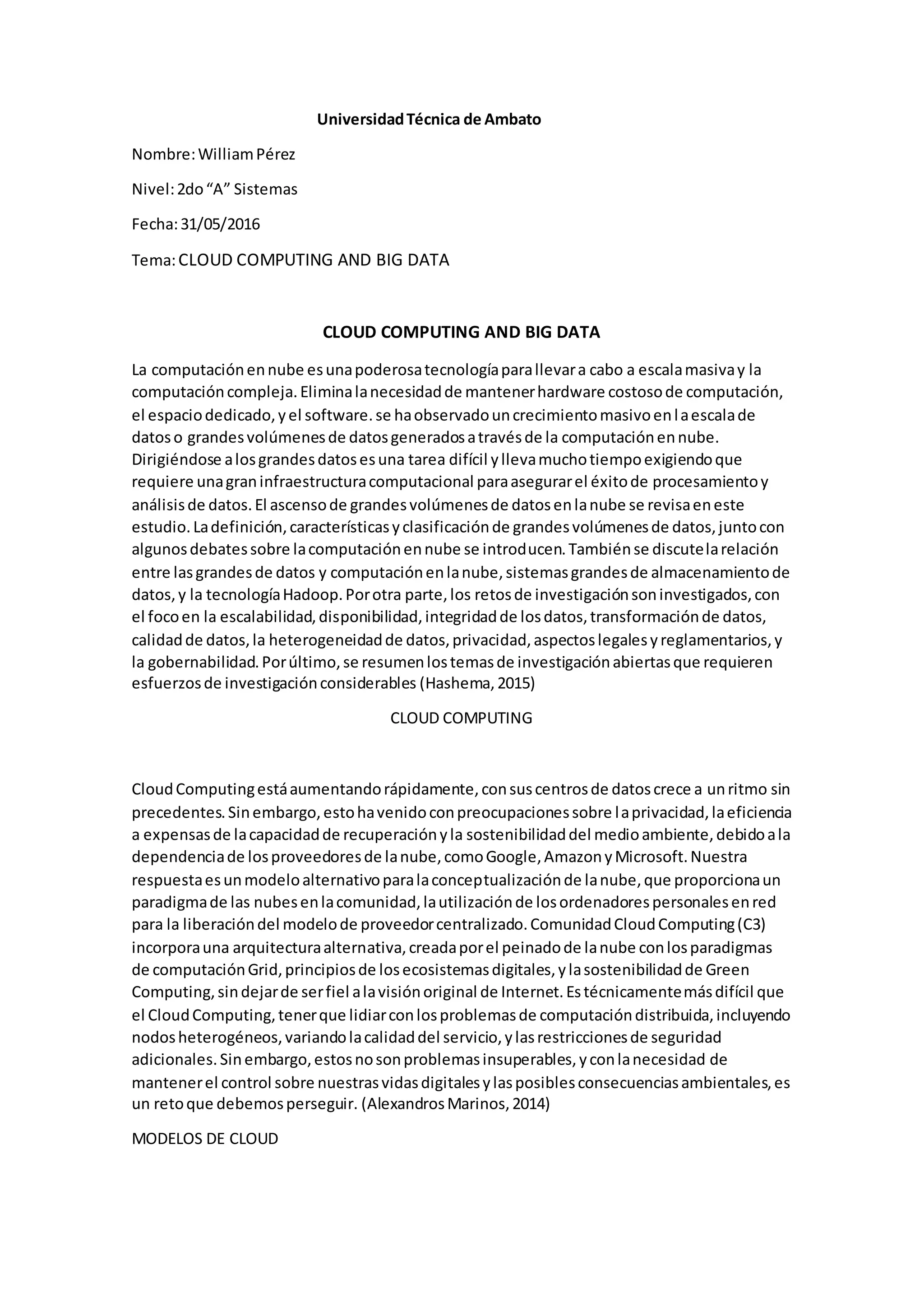 1) El documento habla sobre cloud computing y big data, describiendo sus características y retos como la escalabilidad, disponibilidad y privacidad de datos.