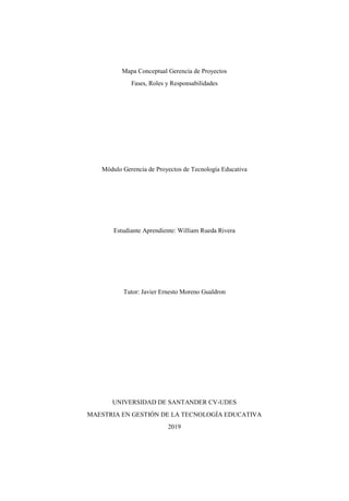 El documento presenta un mapa conceptual sobre la gerencia de proyectos en tecnología educativa, abordando fases, roles y responsabilidades necesarios para llevar a cabo un proyecto exitoso. Se enfatiza la importancia de la planificación, organización, y el control, así como la identificación de los interesados y las características del ciclo de vida del proyecto. Además, se describen los roles del profesional involucrado en cada fase del proyecto y se proporcionan referencias bibliográficas relacionadas.