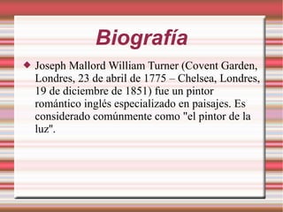 Joseph Mallord William Turner fue un pintor romántico inglés nacido en 1775 que se especializó en paisajes. Asistió a la Royal Academy of Art a los 14 años y viajó extensamente por Europa para estudiar. Turner es conocido por retratar catástrofes naturales y por su uso innovador de la luz y el color, especialmente en sus obras posteriores.