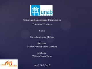 Este documento presenta un resumen de un curso sobre el uso educativo de los medios de comunicación. El curso fue impartido por María Cristina Serrano Guzmán para William Sierra Torres en la Universidad Autónoma de Bucaramanga el 29 de abril de 2012. El curso cubrió objetivos como conocer la televisión educativa, distinguir sus tipos e identificar las etapas de su implementación.