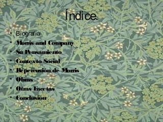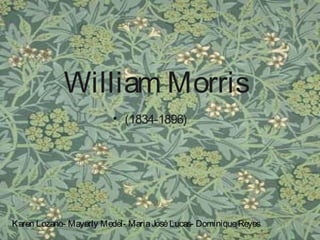 William Morris fue un escritor, pintor, diseñador y reformador inglés que fundó la compañía Morris and Company en 1861 para promover sus ideales del movimiento Arts and Crafts. Creía que el arte debía ser accesible para todos y diseñó una variedad de productos como papel tapiz, textiles y libros. Tuvo una gran influencia en el diseño y la arquitectura de su época y promovió la idea de que los objetos cotidianos deben ser tanto funcionales como estéticamente placenteros.