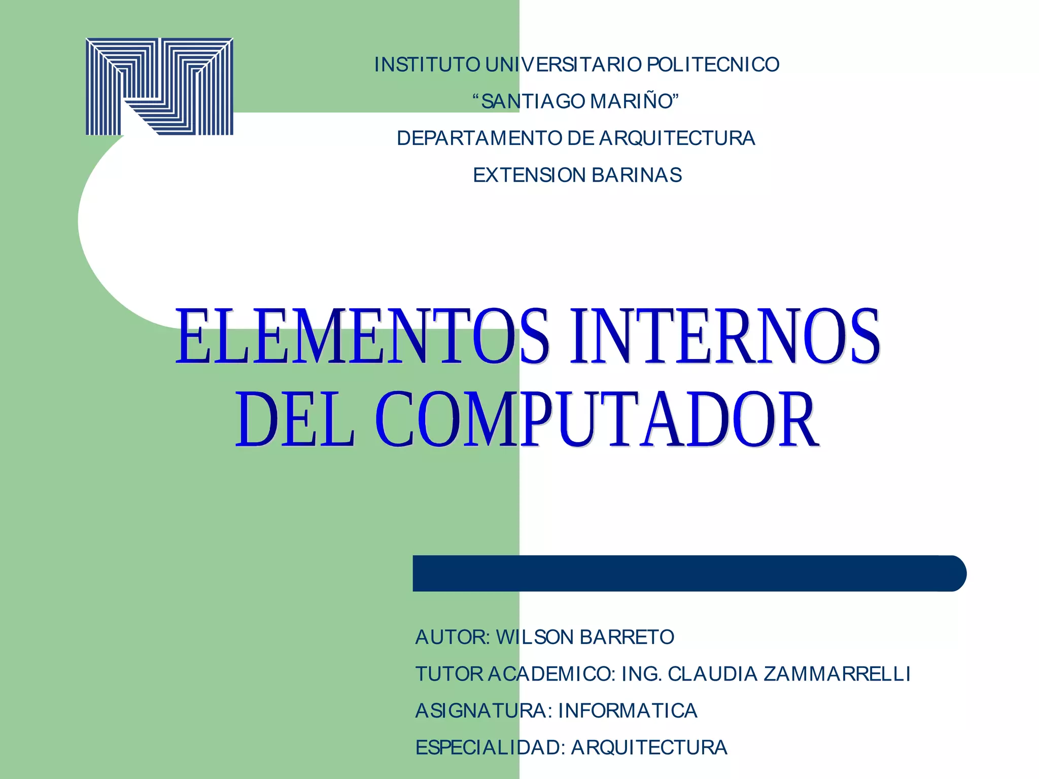 El documento proporciona una breve descripción de los principales componentes internos de una computadora, incluyendo la tarjeta madre, la unidad de disco duro, la CPU, la memoria RAM, la tarjeta de video, las tarjetas de sonido y red, y la fuente de alimentación. Explica que estos componentes varían entre modelos de computadora.