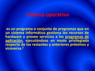 Un sistema operativo es un programa que gestiona los recursos del hardware y provee servicios a los programas de aplicación. Ejecuta en modo privilegiado y administra la localización y protección del acceso al hardware, aliviando a los programadores. Los sistemas operativos incluyen DOS, Windows, Mac OS y UNIX, los cuales varían en su interfaz, soporte multiusuario y compatibilidad con hardware.