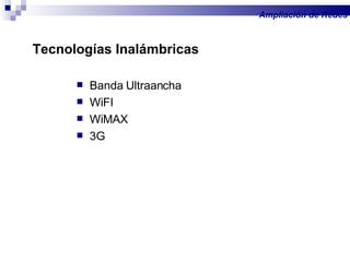 El documento describe las redes inalámbricas WiMAX, incluyendo su definición, características técnicas como la modulación OFDM y topología punto-multipunto, y su funcionamiento basado en estándares IEEE 802.16. Compara WiMAX con WiFi, destacando que WiMAX está diseñado para soluciones de última milla en redes metropolitanas de área amplia, mientras que WiFi es para conexiones inalámbricas internas. También resume el papel de Intel como principal impulsor de WiMAX y sus contribuciones a las