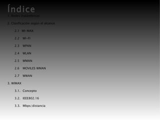 Las redes inalámbricas clasifican según su alcance en WIMAX (hasta 50 km), WIFI (5-100 m), WPAN (10 m), WLAN (100 m), WMAN (ciudad o distrito) y WWAN (4-10 km). WiMAX (IEEE 802.16) provee acceso de banda ancha inalámbrico de hasta 20 Mbps a 6 km y se usa para internet de alta velocidad, voz, datos y conectividad móvil. El WiMAX Forum certifica la interoperabilidad entre equipos de WiMAX.