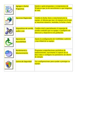El panel de control de Windows permite a los usuarios administrar y personalizar varias configuraciones y ajustes del sistema operativo como agregar o quitar hardware y software, cambiar la apariencia, administrar cuentas de usuario, configurar opciones regionales y de red, y proteger el equipo. Se puede acceder al panel de control a través del menú inicio o mediante atajos de teclado y gestos en Windows 8.