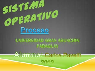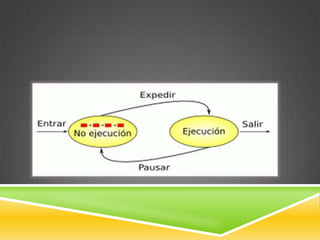 El documento describe los conceptos fundamentales de los procesos en sistemas operativos. Un proceso es un programa en ejecución que consume recursos como memoria, CPU y E/S. Los procesos pueden estar en diferentes estados como ejecutándose, listos o bloqueados, y el sistema operativo los planifica y alterna entre ellos para aprovechar los recursos.
