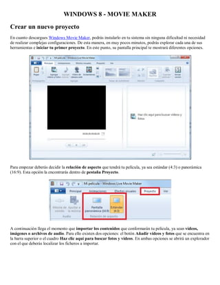 Windows Movie Maker permite crear proyectos de películas de forma sencilla e intuitiva. El programa permite importar videos, imágenes y audio, aplicar transiciones, efectos y música, y exportar la película final para compartirla en redes sociales u otros servicios.