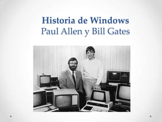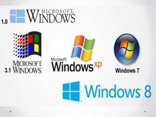 El documento resume la historia de los sistemas operativos Windows de Microsoft desde su primera versión en 1985 hasta Windows 7 de 2009. Destaca versiones clave como Windows 3.0 de 1990, que fue la primera versión popular; Windows NT de 1993, diseñado para servidores; Windows 95 de 1995, que introdujo la arquitectura de 32 bits; y Windows XP de 2001, que unificó las líneas NT y 9x. También menciona sistemas operativos de red como Windows 2000, Windows Server 2003 y Windows Server 2008.