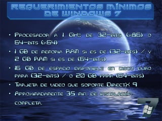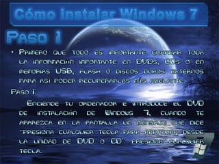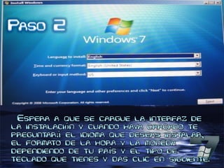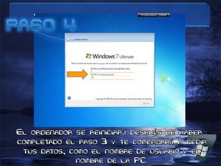 El documento proporciona instrucciones para instalar Windows 7, incluyendo hacer clic en el botón de instalación para que el instalador expanda los archivos y complete la instalación, introducir la contraseña del usuario o dejarla en blanco, introducir la clave de Windows 7 o crackearla, seleccionar la configuración de actualizaciones automáticas, y elegir la zona horaria y fecha para iniciar Windows 7 por primera vez.