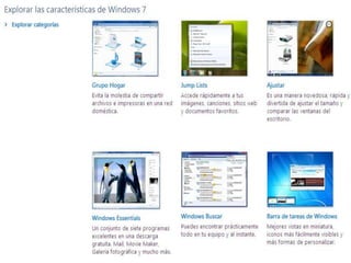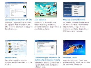 Windows 7 es la versión más reciente del sistema operativo de Microsoft. Ofrece características que permiten realizar tareas de manera más fácil y rápida, además de ser más ligero, estable y rápido. Incluye mejoras en el rendimiento, una interfaz rediseñada y capacidades táctiles multi-touch. Estará disponible en versiones para arquitecturas de 32 y 64 bits.