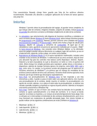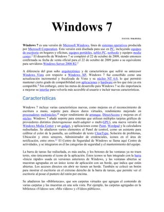 Windows 7 es una versión de Microsoft Windows diseñada para uso en PC como equipos de escritorio, portátiles y tabletas. Aunque mejora la interfaz de usuario y agrega nuevas características, mantiene compatibilidad con hardware y aplicaciones de Windows Vista. Windows 7 incluye mejoras como soporte para tarjetas gráficas múltiples, nuevas aplicaciones como Paint rediseñadas, y características como bibliotecas y listas de saltos.