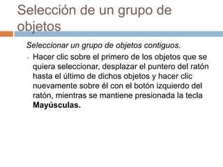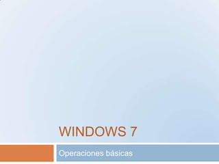Este documento describe las operaciones básicas de selección, copia, movimiento, creación, eliminación y compresión de archivos y carpetas en Windows 7. Explica cómo seleccionar objetos individuales o grupos mediante clics del ratón o teclas de control, y cómo mover o copiar elementos entre carpetas arrastrándolos. También detalla cómo crear nuevas carpetas a través del menú contextual, eliminar elementos usando la tecla Supr o la papelera, y comprimir archivos en una carpeta zip.