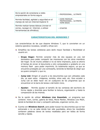 Windows 7 es el sucesor de Windows Vista diseñado para uso en PC. Mejora la interfaz de Vista haciéndola más accesible y flexible para los usuarios. Incluye características como Jump Lists que permiten acceder fácilmente a documentos usados recientemente. Viene en varias ediciones como Home Premium, Professional y Ultimate, que difieren en funcionalidades como la capacidad de unirse a redes empresariales de forma segura.