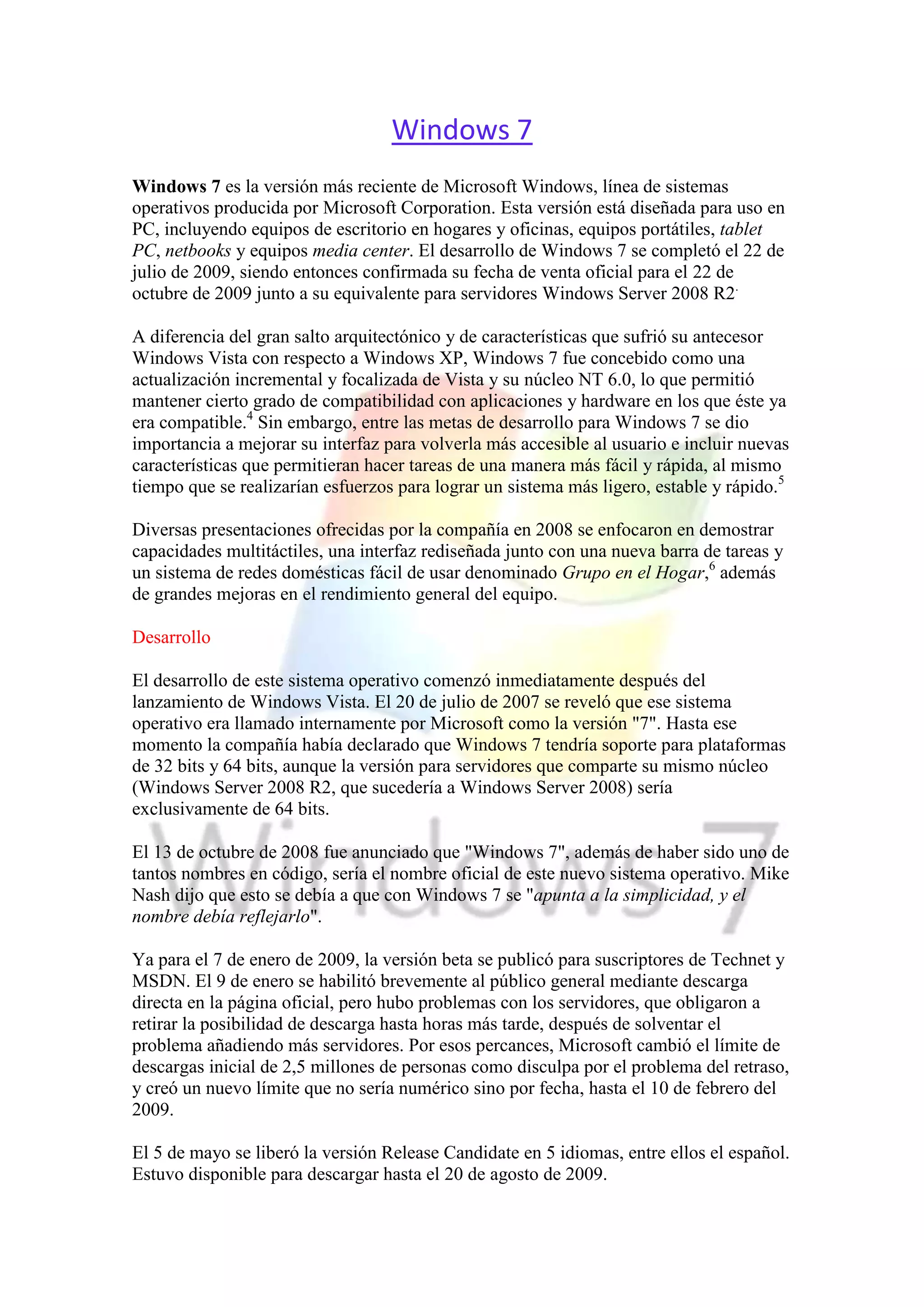 El documento describe las características y el desarrollo de Windows 7. Windows 7 es la versión más reciente del sistema operativo Windows de Microsoft, lanzada en 2009. Incluye mejoras en el rendimiento, la interfaz, el soporte multitáctil y nuevas características como las bibliotecas y las listas de saltos. El desarrollo comenzó después del lanzamiento de Windows Vista y la versión final se lanzó en octubre de 2009.