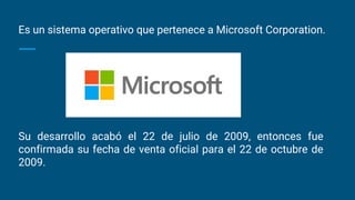 Windows 7 es un sistema operativo de Microsoft lanzado en 2009. Incluye características como mayor velocidad de carga, compatibilidad con más dispositivos, mayor seguridad y control, y menor consumo de energía y memoria. Viene en varias ediciones como Home Premium, Professional y Ultimate dirigidas a diferentes usos y necesidades.