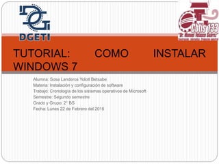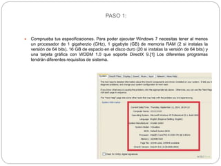 Este documento proporciona una guía paso a paso para instalar Windows 7. Explica los 22 pasos requeridos, que incluyen comprobar las especificaciones del sistema, hacer copias de seguridad de los datos, configurar el BIOS para iniciar desde el CD, elegir las preferencias de idioma y teclado, aceptar los términos de uso, instalar los archivos, configurar la cuenta de usuario, actualizar el sistema, e instalar programas y antivirus.