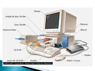 El documento habla sobre la introducción a la computación en Windows 7. Explica las definiciones básicas de una computadora, incluyendo los componentes de hardware como la CPU, memoria y dispositivos de entrada y salida. También describe los sistemas operativos, sus funciones y la evolución de versiones importantes de Windows como Windows 95, Windows XP y Windows 7.